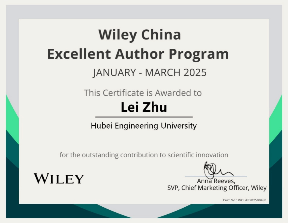 我校朱磊教授荣获2025年第一季度“Wiley中国高贡献作者”奖