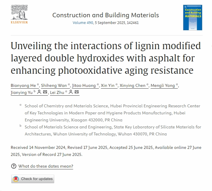 近日,我校何边阳副教授以第一作者身份在国际知名学术出版商爱思唯尔(Elsevier)旗下Top期刊《Construction and Building Materials》(SCI,中国科学院一区,JCR一区,影响因子8.0)上发表题为“Unveiling the interactions of lignin modified layered double hydroxides with asphalt for enhancing photooxidative aging resistance”的科研文章。湖北工程学院为第一署名单位,朱磊教授为论文通讯作者。沥青作为基础设施建设中的关键材料,...
