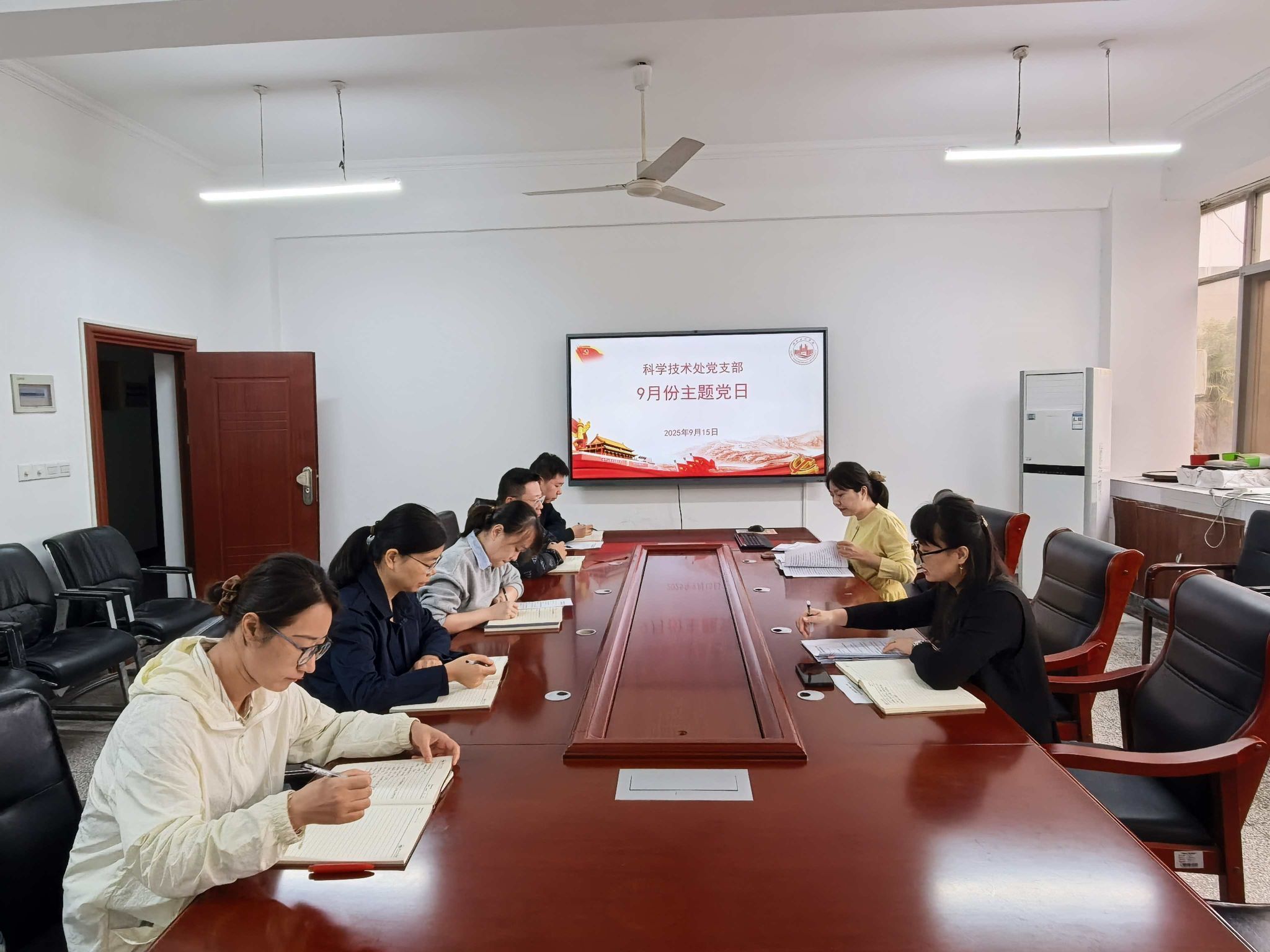 2025年9月15日,科学技术处党支部开展9月份支部主题党日活动。支部全体党员参加,入党积极分子曹娴、昌亚雄列席。活动由科学技术处党支部书记黄丽珍主持。