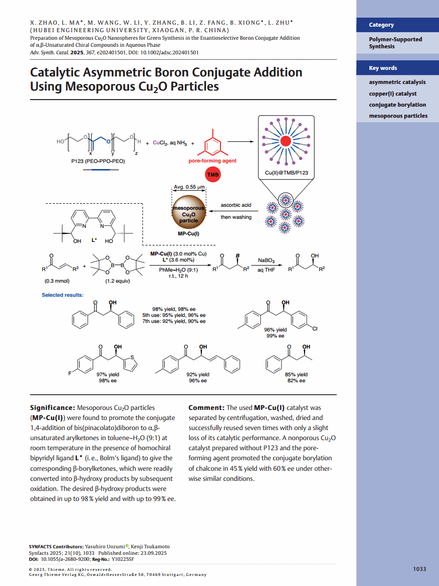 近期,我校朱磊教授团队于2025年1月在《Advanced Synthesis & Catalysis》上发表题为“Preparation of Mesoporous Cu2O Nanospheres for Green Synthesis in the Enantioselective Boron Conjugate Addition of α,β-Unsaturated Chiral Compounds in Aqueous Phase”的研究论文(Adv. Synth. Catal. 2025, 367, e202401501 (1 of 10))被国际著名化学评论期刊SYNFACTS杂志作为亮点工作进行推介(DOI: 10.1055/a-2680-9200)。该论文第一作者为硕士赵旭红同学,马莲和熊勃博士同为指导教师。评论指出朱磊教授团队此项工作的重要性在于,通过研究发现介孔Cu₂O纳米颗粒(MP-Cu(I))在高效手性联吡啶配体L*(即Bolm配体)存在下,能够在甲苯-水(9:1)混合溶剂中,于室温条件下催化双(频哪醇)二硼与α,β-不饱和芳基酮发生共轭1,4-加成反应,生成相应的β-硼基酮产物。该产物可进一步经氧化反应顺利转化为β-羟基化合物,最终以高达98%的收率和99%的对映选择性(ee)获得目标β-羟基产物。