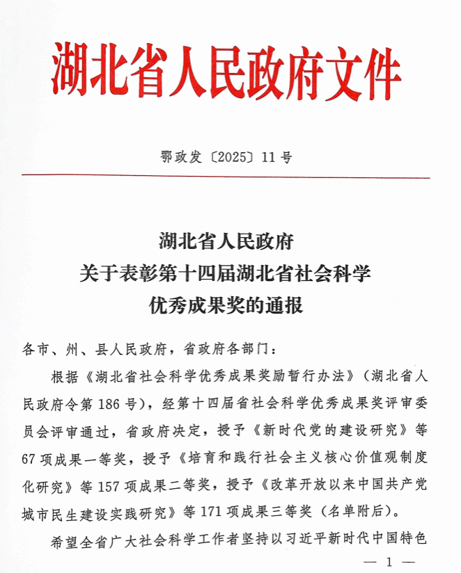 湖北省社会科学优秀成果奖是我省社科领域最高级别奖项,由省政府设立、每两年评审一次,旨在表彰助力学术发展与理论创新的优秀成果。湖北省社会科学成果奖以其独特价值,汇聚荆楚大地的智慧力量,积极引导科研工作者围绕重大理论与现实问题开展创新探索,为社科事业发展注入持久动能,也为湖北高质量发展提供坚实的理论支撑与智力保障。