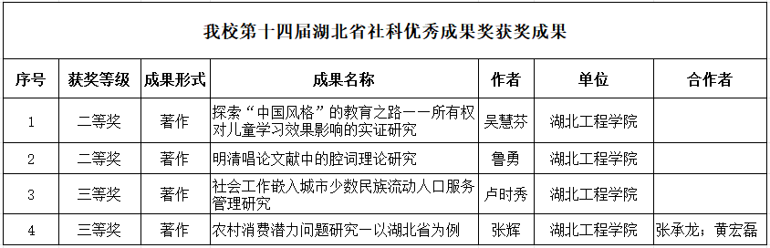 近日,湖北省人民政府发布了“第十四届湖北省社会科学优秀成果奖”表彰通报,我校载誉而归,共有4项成果脱颖而出,荣膺二等奖2项、三等奖2项。无论获奖等级还是获奖总数,均创学校参评该奖项以来的历史最佳成绩,实现了历史性突破。
