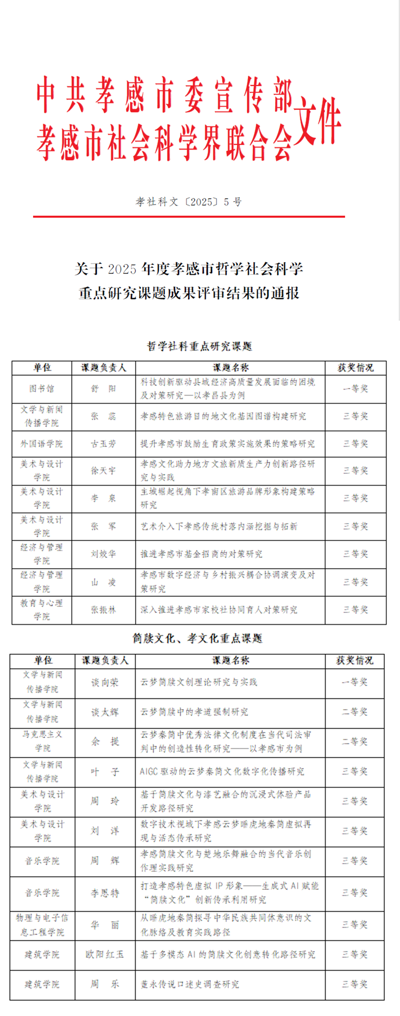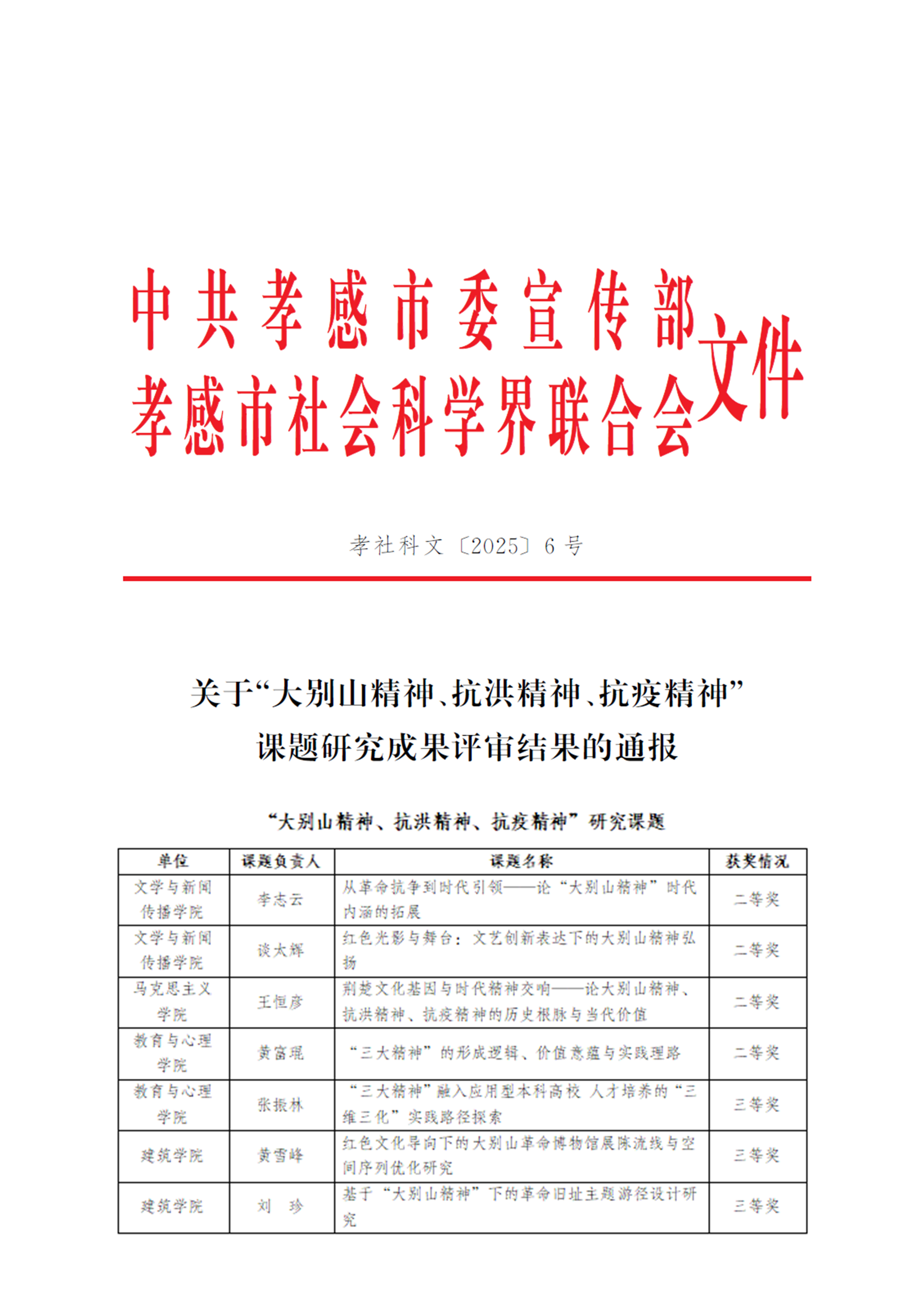 近日,中共孝感市委宣传部、孝感市社会科学界联合会联合公布了《关于2025年度孝感市哲学社会科学重点研究课题成果评审结果的通报》(孝社科文〔2025〕5号)和《关于“大别山精神、抗洪精神、抗疫精神”课题研究成果评审结果的通报》(孝社科文〔2025〕6号)。在全市194项参评课题成果中,我校70位教师的研究课题顺利通过结项验收,获奖等次与数量在全市各单位中名列前茅,彰显了学校在地方特色文化研究与社科应用研究领域的扎实功底。