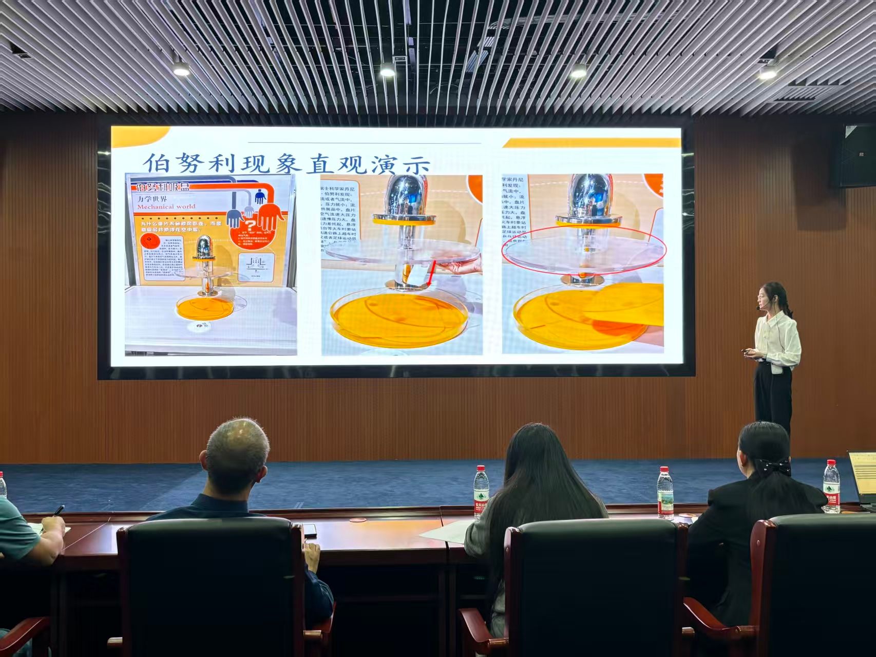 比赛环节中,选手们依次登台展现风采:杨思琦结合古代计量文化讲解“大秤”,李思晨通过实验演示“伯努利吸盘”原理,精彩表现赢得全场认可。现场6位评委团老师,全程专注聆听、认真记录,针对每一项评分标准细致打分,以严谨态度保障赛事结果的公平性与权威性。
