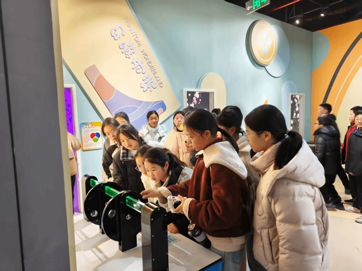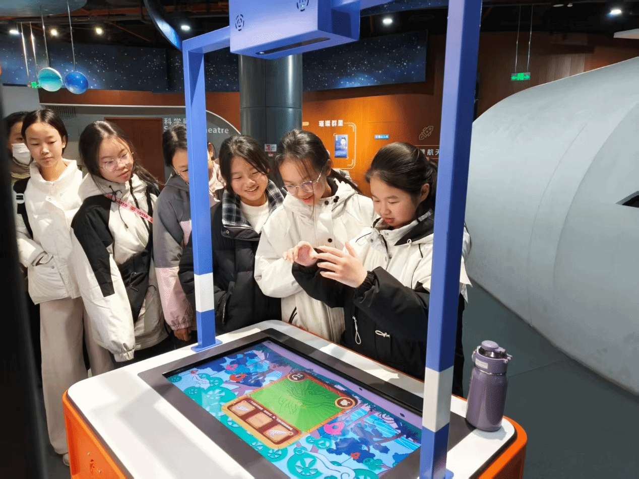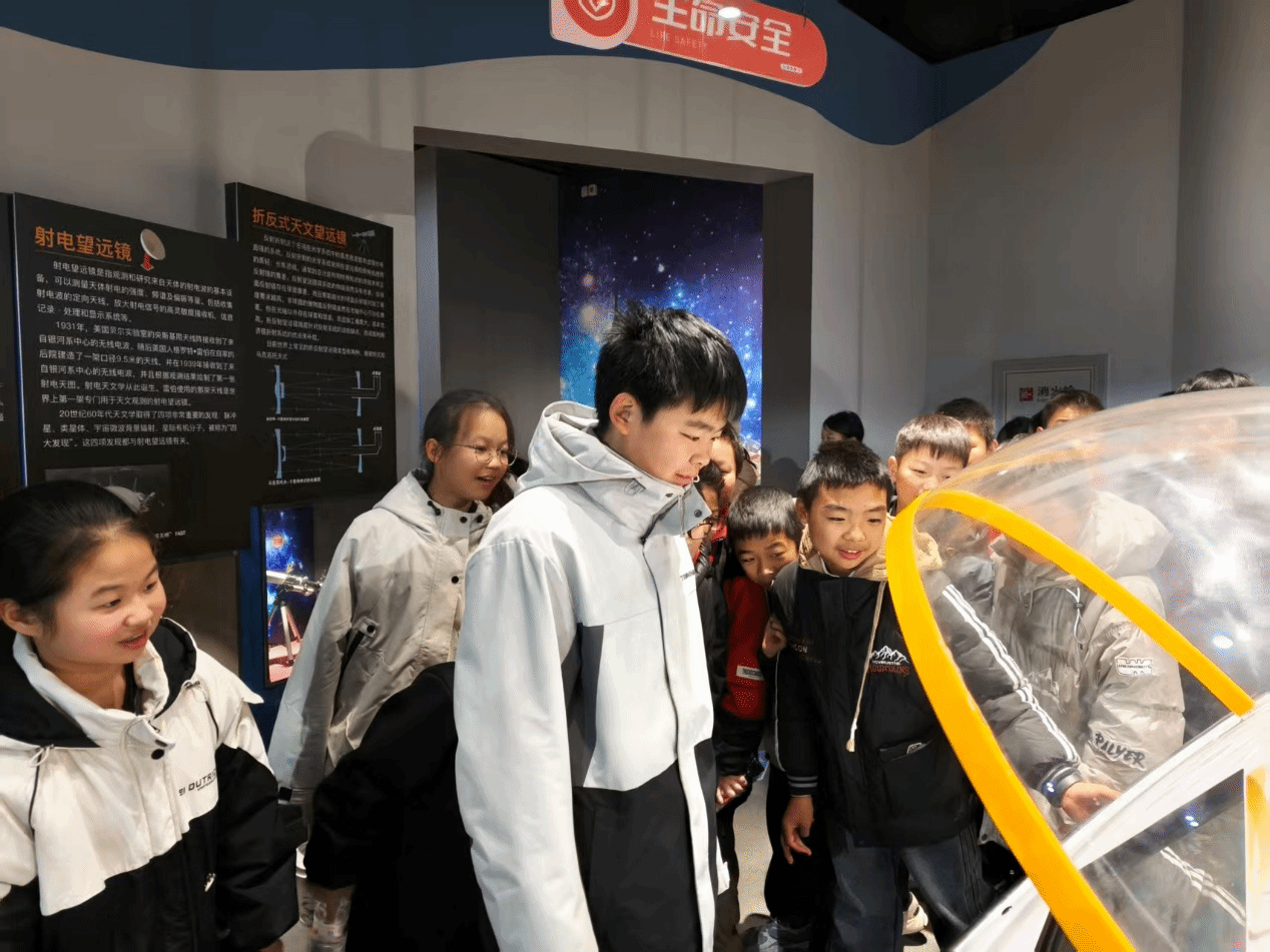 在科技馆志愿者的引导和讲解下,同学们对各类展品表现出浓厚兴趣。在“机械韵律联动装置”前,大家亲手转动转盘,观察数百个精密零件有序运转,将小球精准传递至下一环节,感受机械的力量与韵律之美,现场不时传来阵阵惊叹。在“科学乐园”展区,同学们积极参与“自己拉自己”“抓棒测试”等互动项目,在实践中直观理解力学原理与反应速度的科学内涵。“寻梦太空”展区陈列的玉兔号月球车模型、太空舱仿真装置等,则让大家沉浸式体验中国航天的辉煌成就,激发了对浩瀚宇宙的无限向往。这场科普之旅,如同一场奇妙的科技派对,将知识转化为看得见、摸得着的快乐,悄然在孩子们心中播下探索科学的种子。